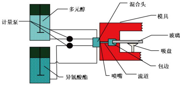 将双组分PU原料精确计量后,由高压计量泵输送到混合头内高压混合,注入放置有玻璃的模具内,在模具型腔表面反应聚合固化,制得玻璃边缘包覆有PU材料的玻璃制品,该包边类型具有优良的耐候性和力学性能。